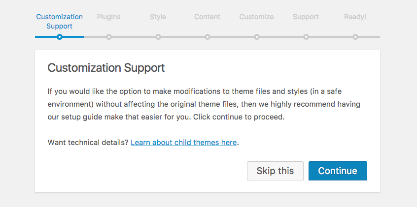 If you would like the option to make modifications to theme files and styles (in a safe environment) without affecting the original theme files, then we highly recommend having our setup guide make a child theme for you.